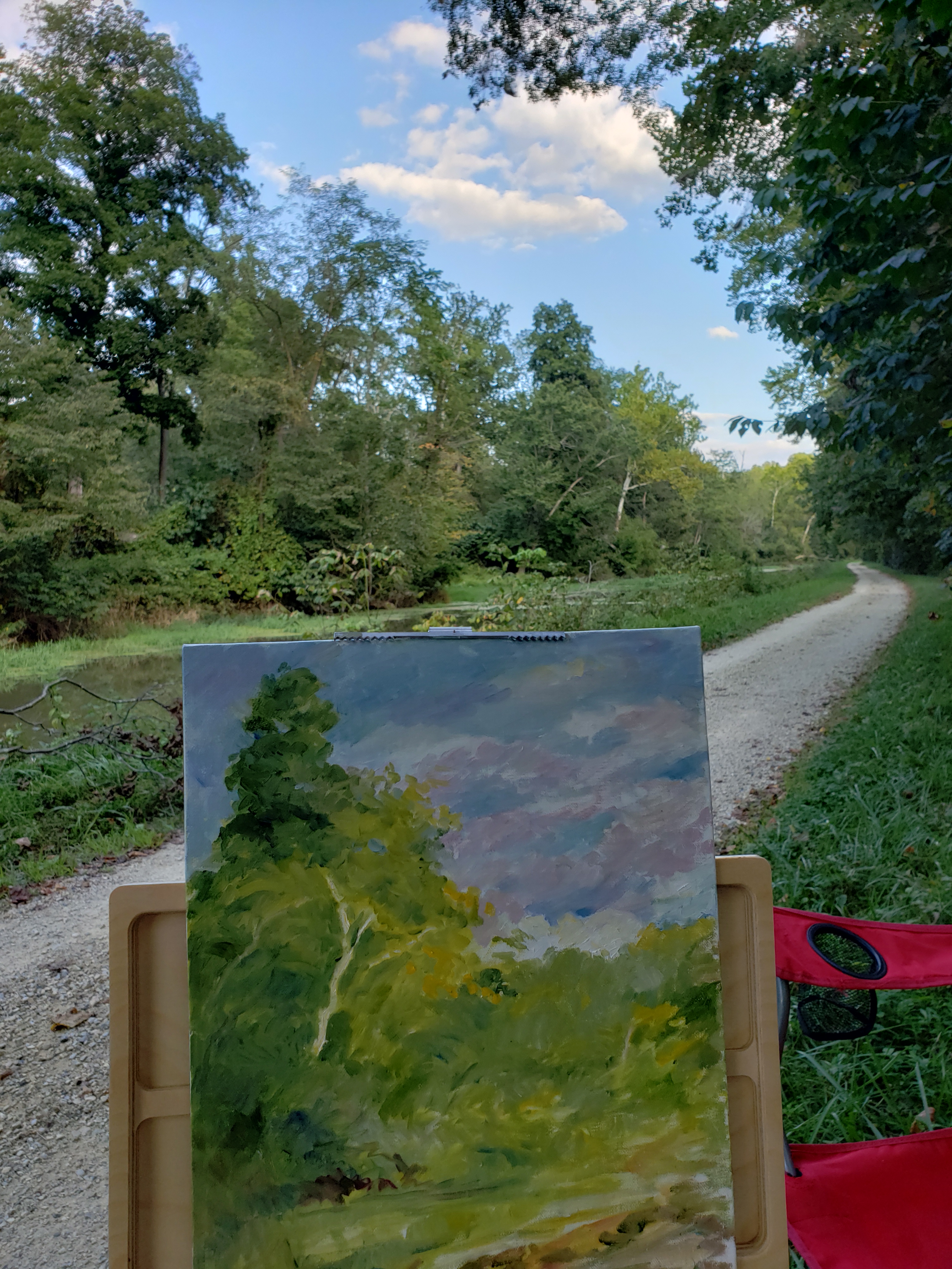 It was a glorious September Day out on the C& O Canal. This little study was done in approximately one hour. Couldn’t take the bugs much longer as I was sitting right in a bushy area off to one side of the canal. You have to be careful on a Saturday as there are many bicyclist, birders and hikers on the trail. It was such a pretty day and I was enjoying the scenery so much I just kept walking. In fact, it took longer to walk to this spot then it did to paint. One thing you have to remember when you walk down the canal you will have to return the same way . There is no crossing the canal only at the lock stations and the next one up was three miles ahead. Sure did not want to do that carrying painting gear.