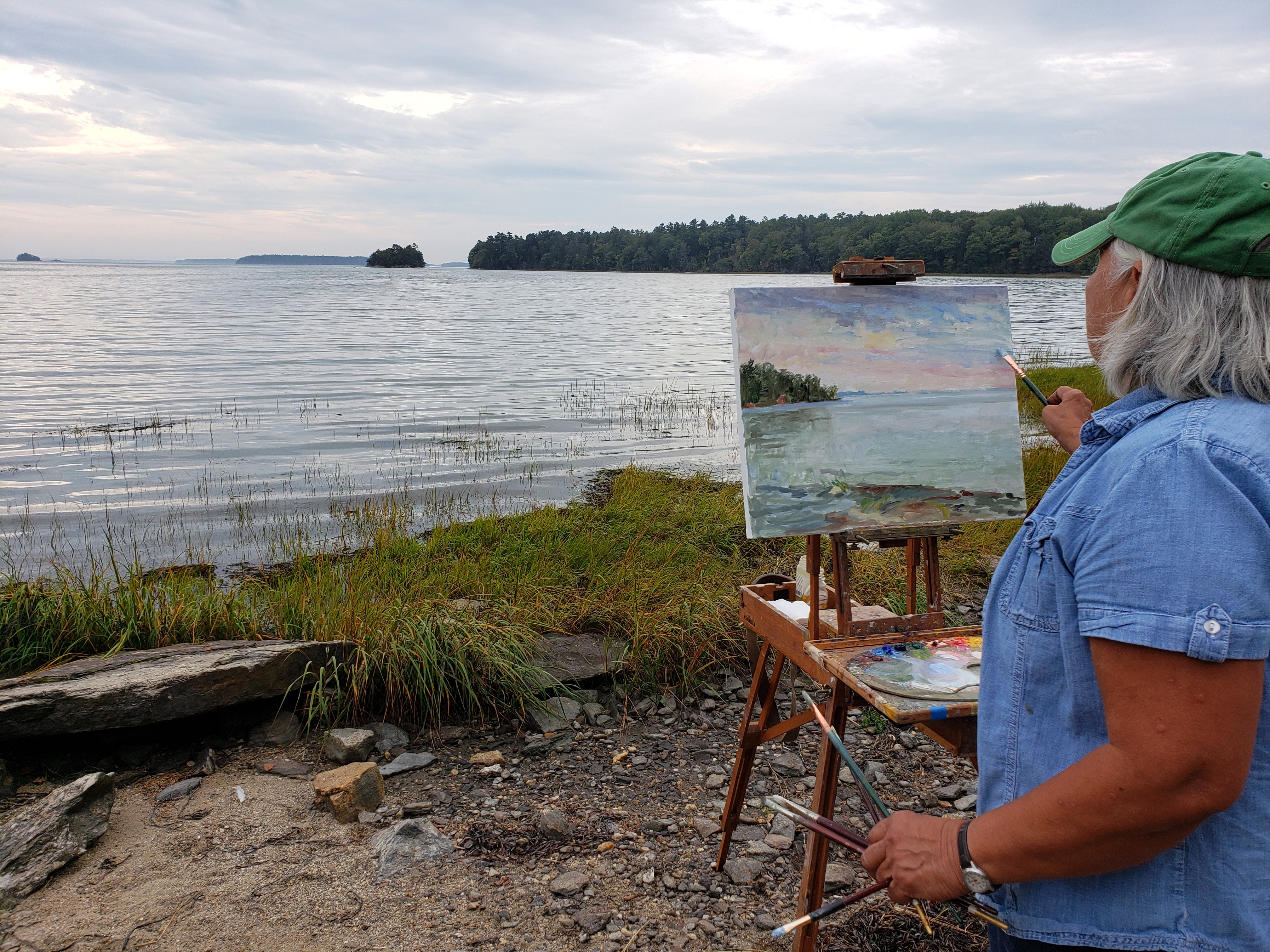 I have been painting all week, first a morning painting, then a bite to eat and then an evening painting. We are lucky it has been unseasonably warm this week. Near by is the Maritime Museum in Bath, well worth the $16 even though Mr. thrifty complained. A visit to the oldest lighthouse in Maine, the Portland Head Lighthouse in Portland. George Washington approved the construction. A great place to eat is at Becky’s Restaurant Cafe at 390 Commerce Street. Legend has it Becky was the unfortunate wife of an abuser husband. She left him, started her own business and each day he has to pass this successful business in his boat.