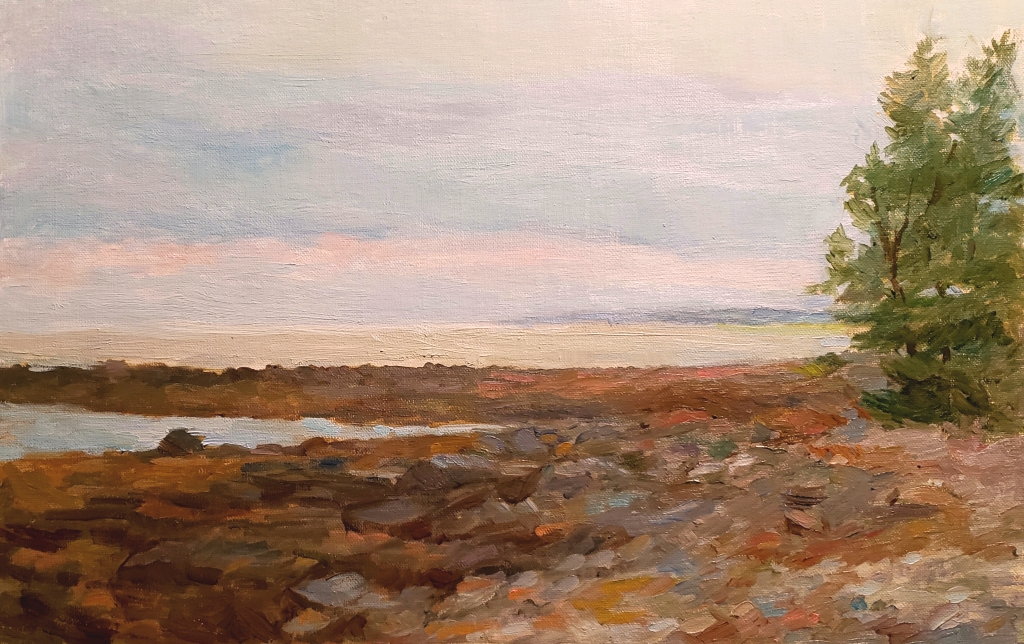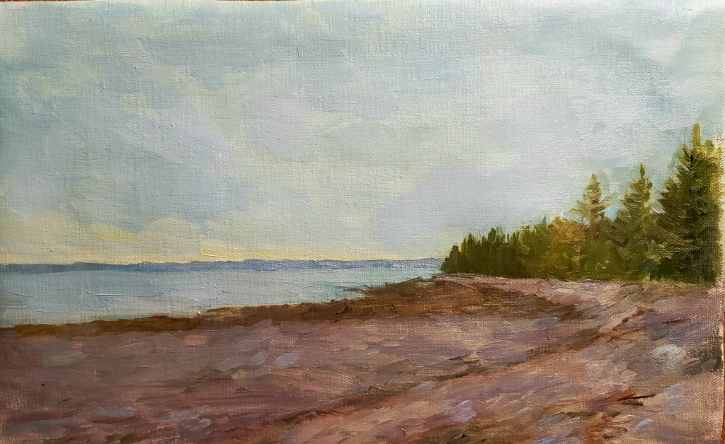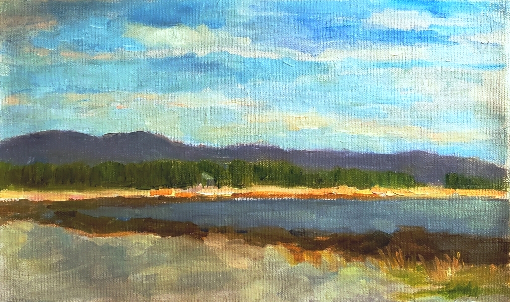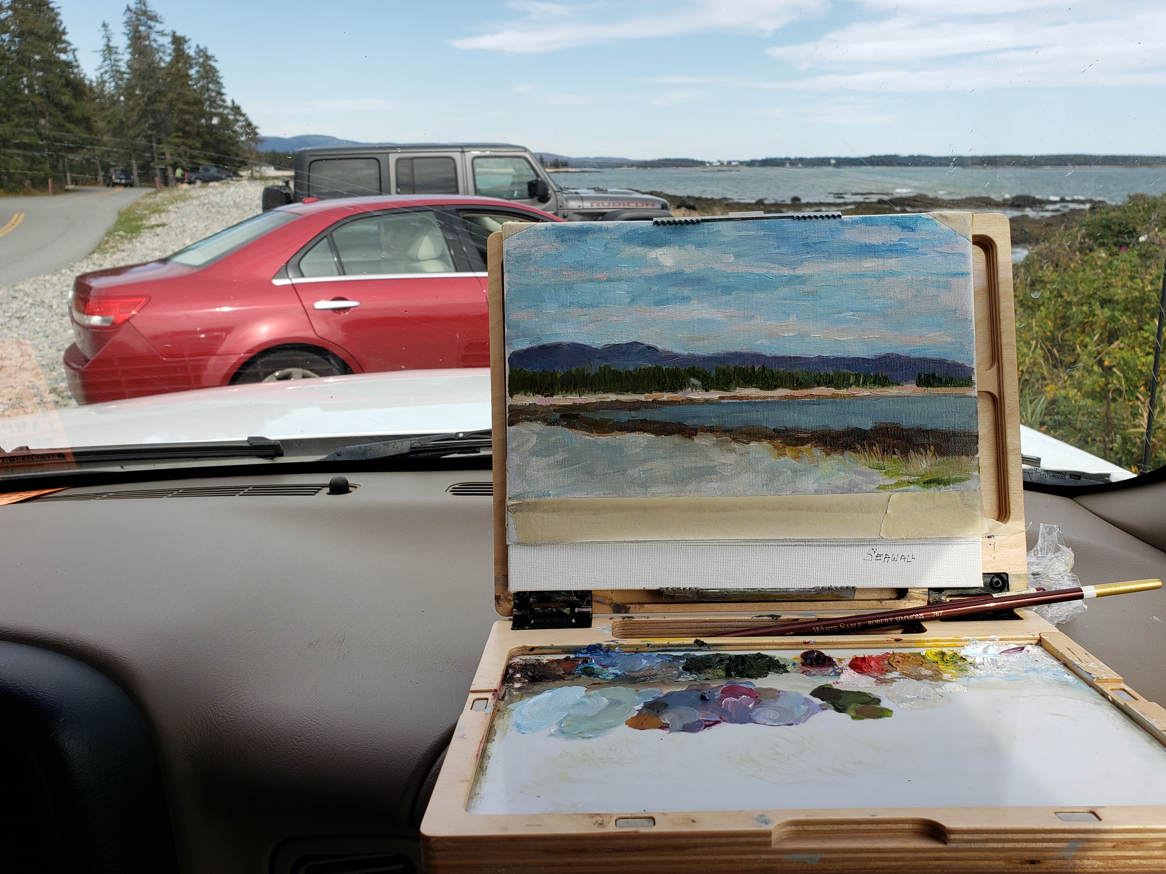 Several great painting spots nearby the campground. My favorite is “Seawall”. This is a fascinating natural rocky shoreline. I could paint here for months and never be bored. The light and the changing tides change from minute to minute. It is a challenge. This little study I had to paint from the inside of the truck because it was just too windy. Love my knew little pochade box used for this purpose https://newwaveart.com/products/u-go-plein-air-anywhere-pochade-box-large. I highly recommend this sturdy little pochade box. Luckily I finished the painting before the cars pulled out in front. On our last day the weather changed to a balmy sixties. Unseasonably warm say the locals.