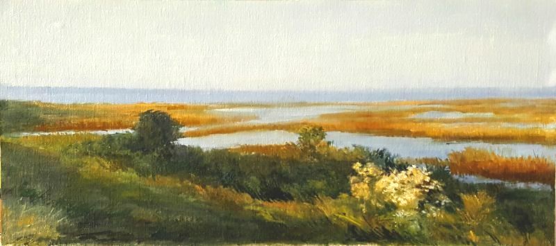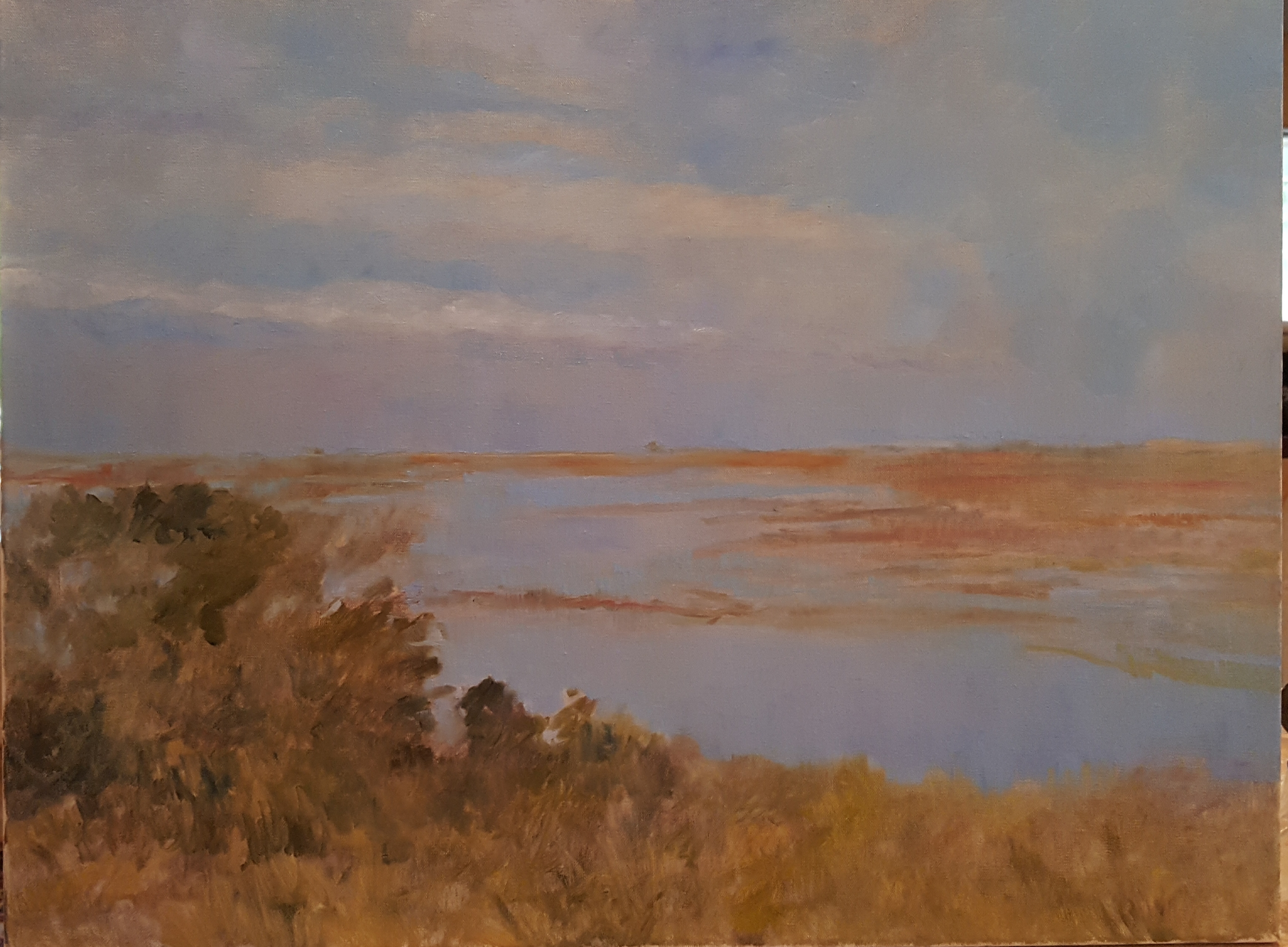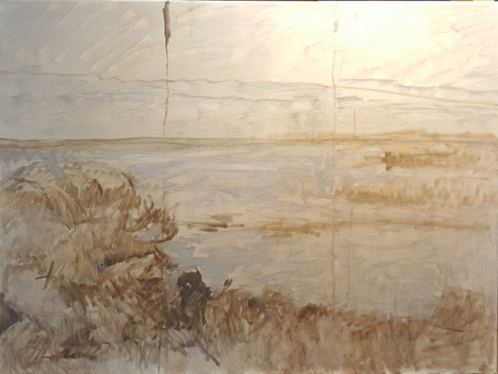 I have painted on this spot several times. It is at the entrance to Assateague Island State Park. It is a gorgeous natural environment. The painting possibilities are endless. There is the ocean, dunes, marshes and inlets. I was struck by the dramatic light on the marsh bay grasses that seemed to be lit from within. It was a very windy day and I did a small study of the area and took several pictures. The larger studio painting took on another element from the study. I decided to change the composition completely but utilizing the “color” observation in the smaller study. I have documented some of the steps involved in working in the studio from a smaller sketch and a photograph projected on my computer.