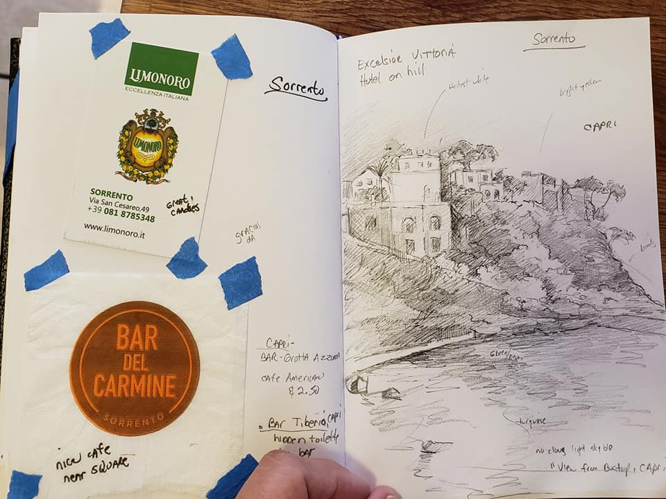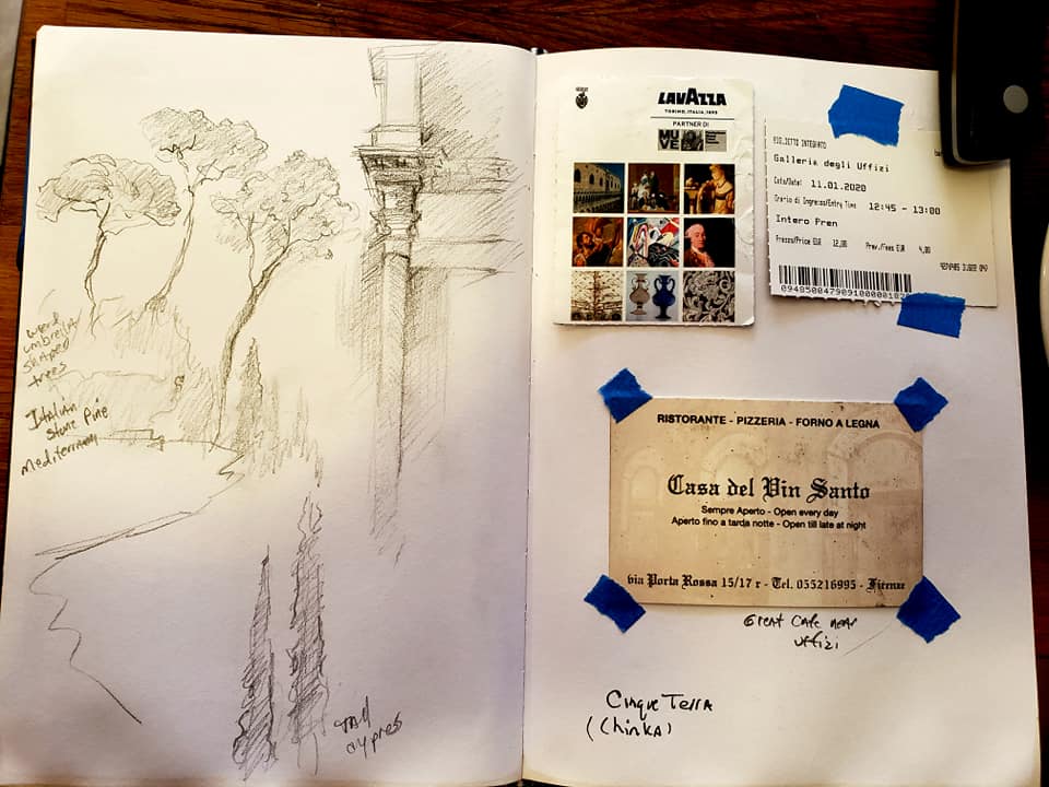 ITALY DREAMSCAPE: This trip really was like a dream. I kept thinking that I have been here before and in fact, I have in the many many books, movies and art of Italy. I can not believe I waited so long to experience this beautiful country. It is every bit as glorious as I had imagined. Each city is so different in character. Thank you Prof. Christine Rai and Prof. Tiziana Cavinato of FCC and our wonderful guide Nancy from Explorica and a special thanks to my daughter Kelli Summers for making this trip happen. Today is my 70th birthday and I can honestly say I do not feel the age but I did feel my old bones not being able to keep up with the young collegiate group from Frederick Community College who we were with on the trip. The pace was hard to maintain and actually not preferable for an artist, as there literally was no block of real time for painting. I did manage to sketch though and enjoyed recording my sensations in a small sketchbook. A typical day jampacked with every ounce of touring you can think of. ROME: today we saw The Sistene Chapel, St. Peter’s Basilica, St.Peters Square, the Coliseum, the Forum. Yesterday The Pantheon, Spanish steps, Trevi fountain. Wayyyyyy too much walking but sure got my money’s worth. No waiting in long lines either.January was a very good time to visit because the crowds were fewer albeit a little chilly. I loved it all….Venice, Florence, Rome, Assisi, Sorrento, Verona, Pompeii and Capri. Bellissimo! Will return someday.