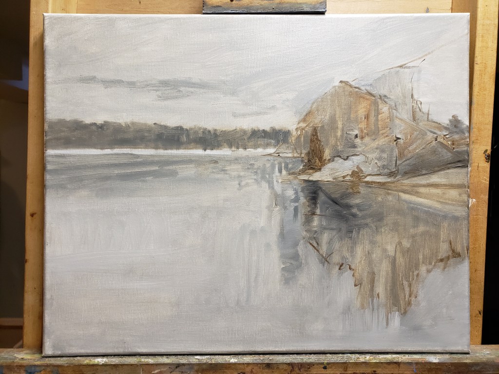 This is the new enlarged version size 16×20. I am using a toned canvas to create an underpainting. Applying loose thin washes to a carefully studied drawing that is using large shapes that will connect to form a pleasing composition. The evergreen tree is used as a “unit of measurement” to measure against