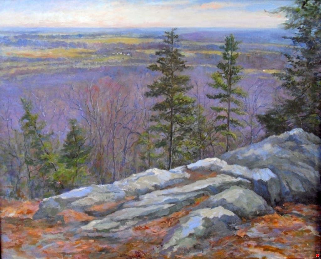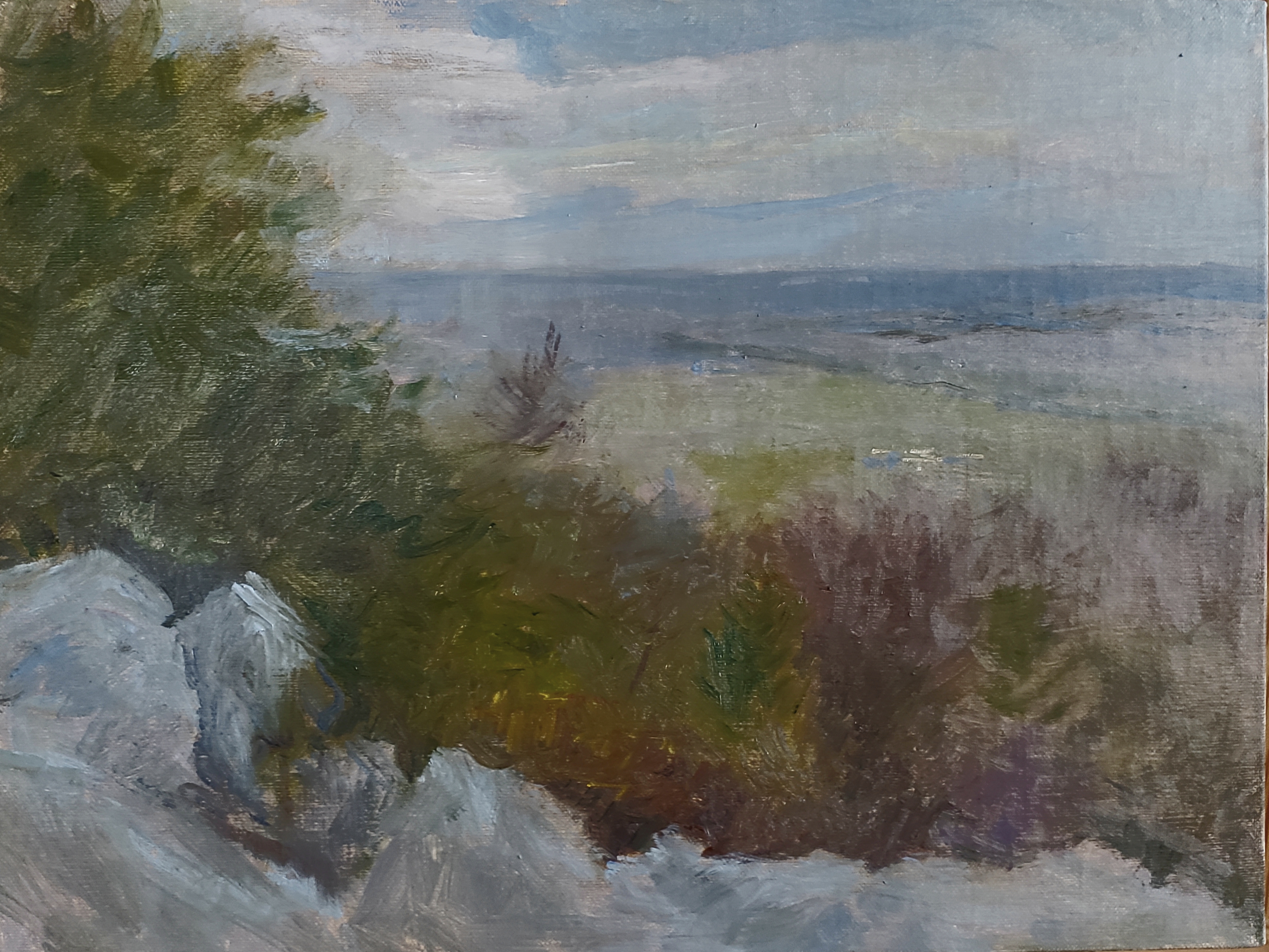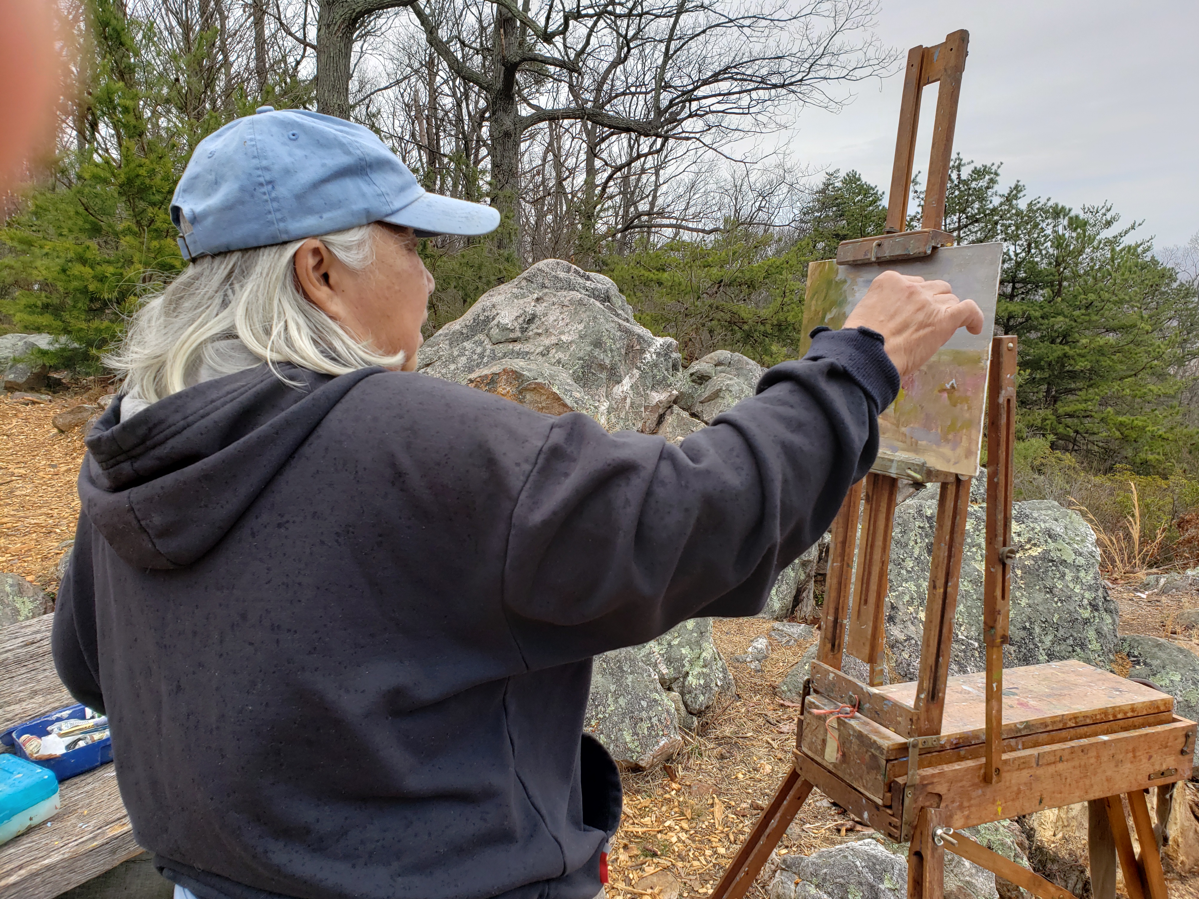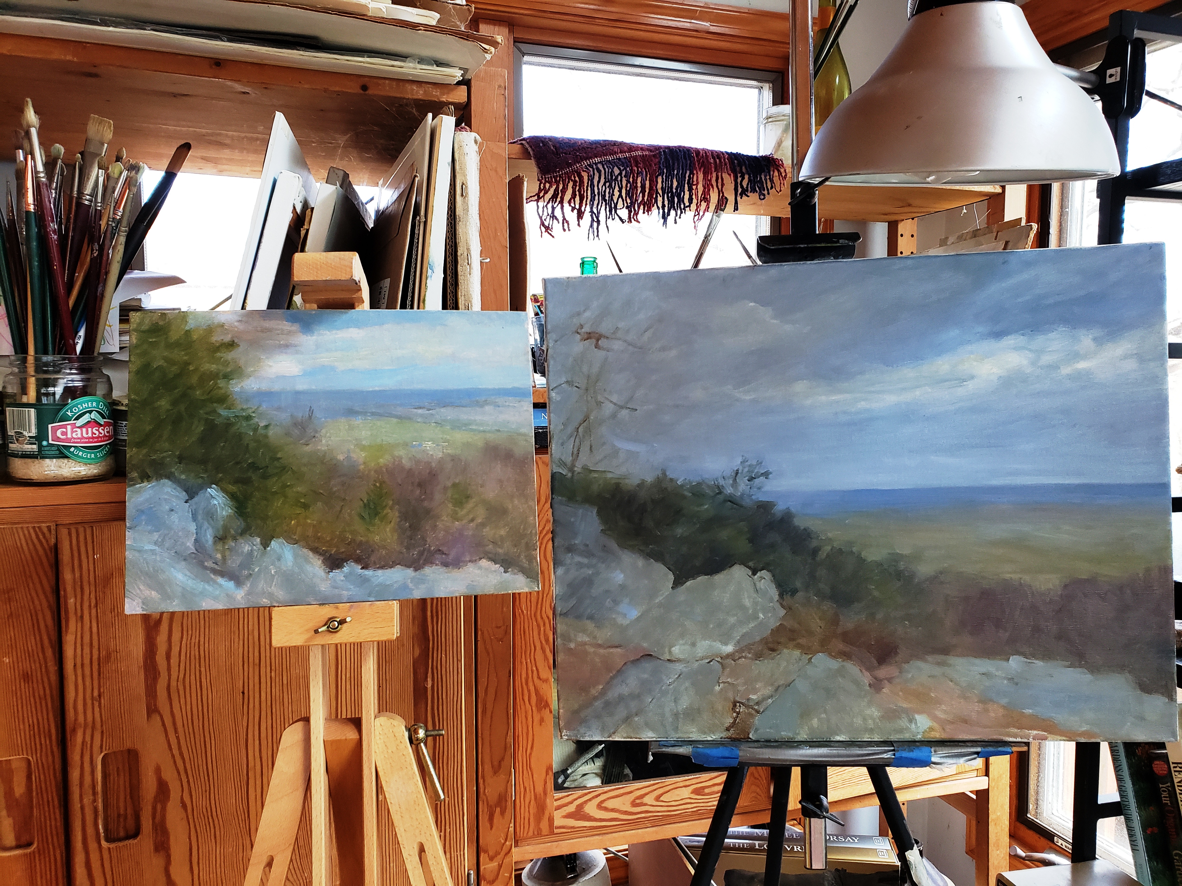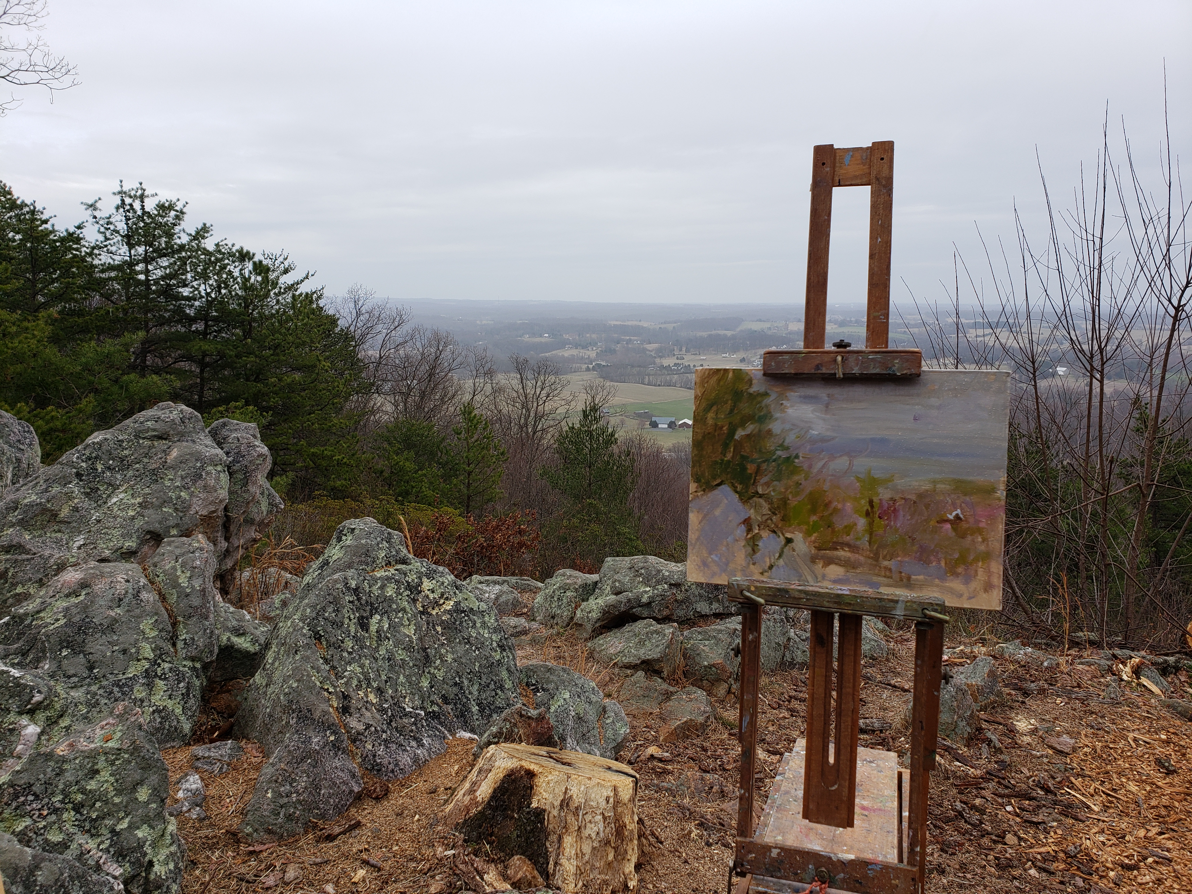 It has been a cold, damp and windy February but I have made myself try to get out there and paint. Thank goodness I have my “studio truck” that I can paint from. On this day, I ventured outside and set up my trusty half-sized french easel which I have had for many years. Everything was perfect, no worries about anything especially the current state of affairs with the impending coronavirus. Up on top of Sugarloaf Mountain the worries just slip away. Yes, it was a very moody but inviting gray day, a Corot kind of day. After only about a half an hour it started to drissle, then the rain got heavier and I was forced to quit. In the old days I would have put up an umbrella. In fact, I have done some nice paintings in the rain when visiting Ireland but today I simply took what information I had from the study and left. Corot would have stayed I think because he said “One can see Nature’s true colors in the rain”