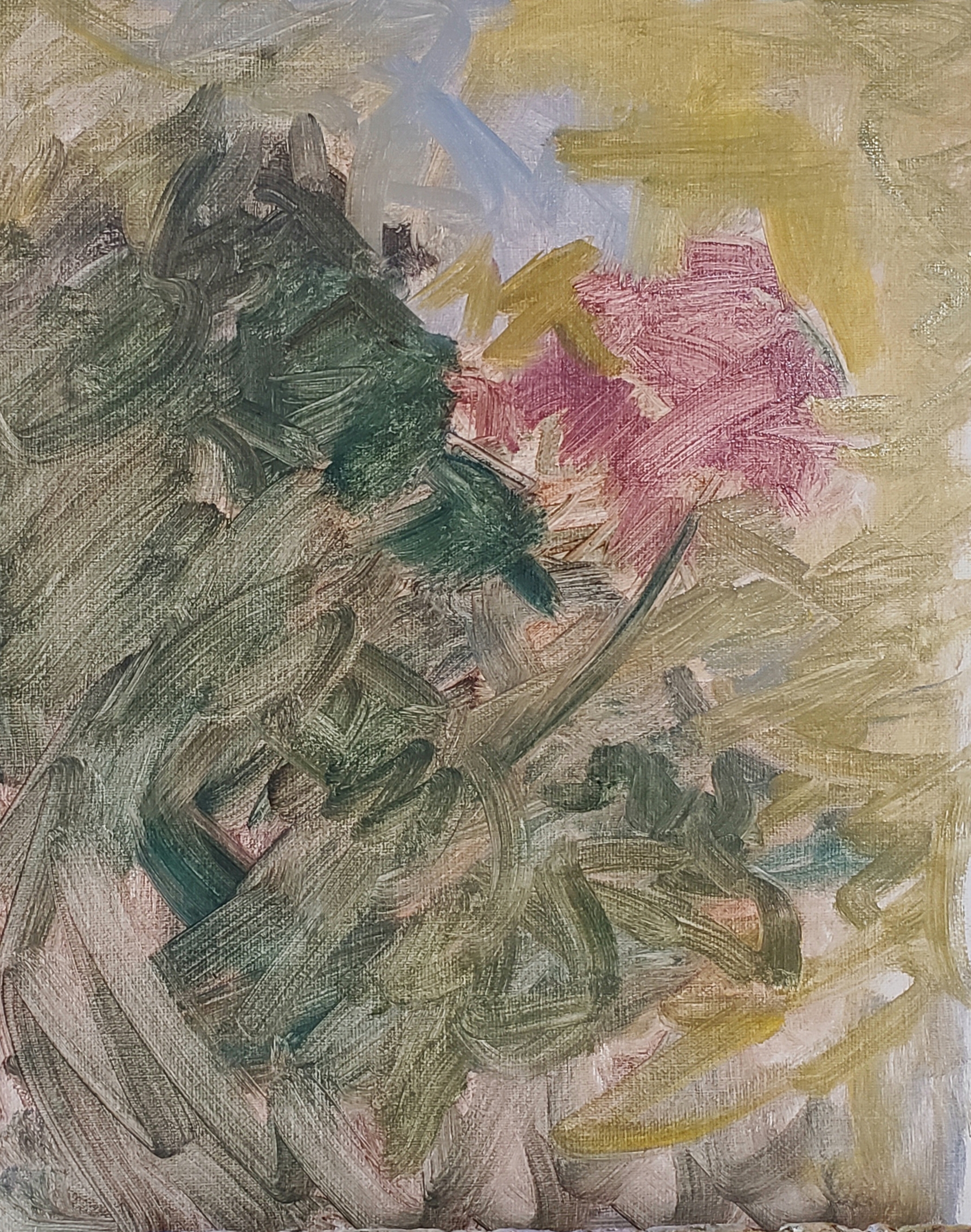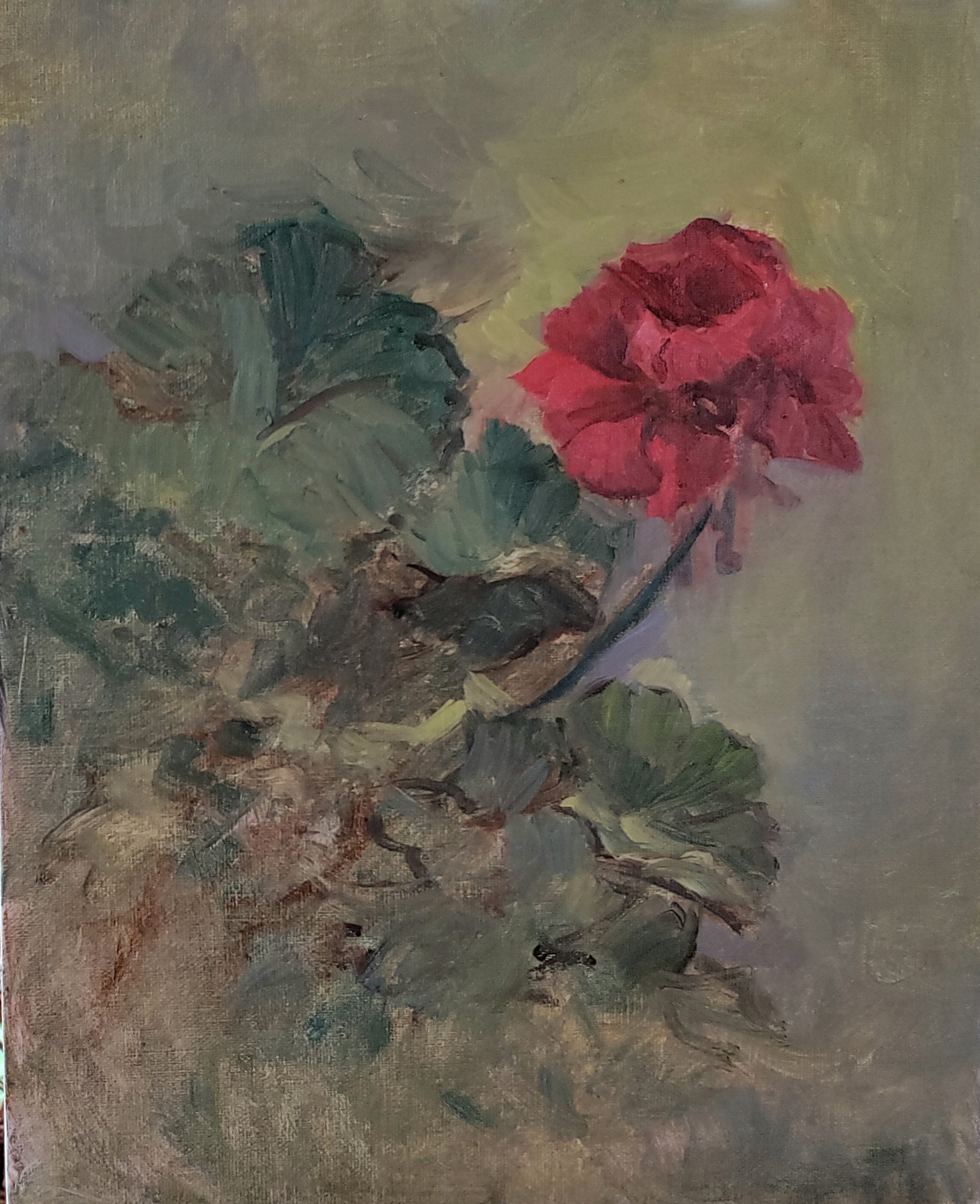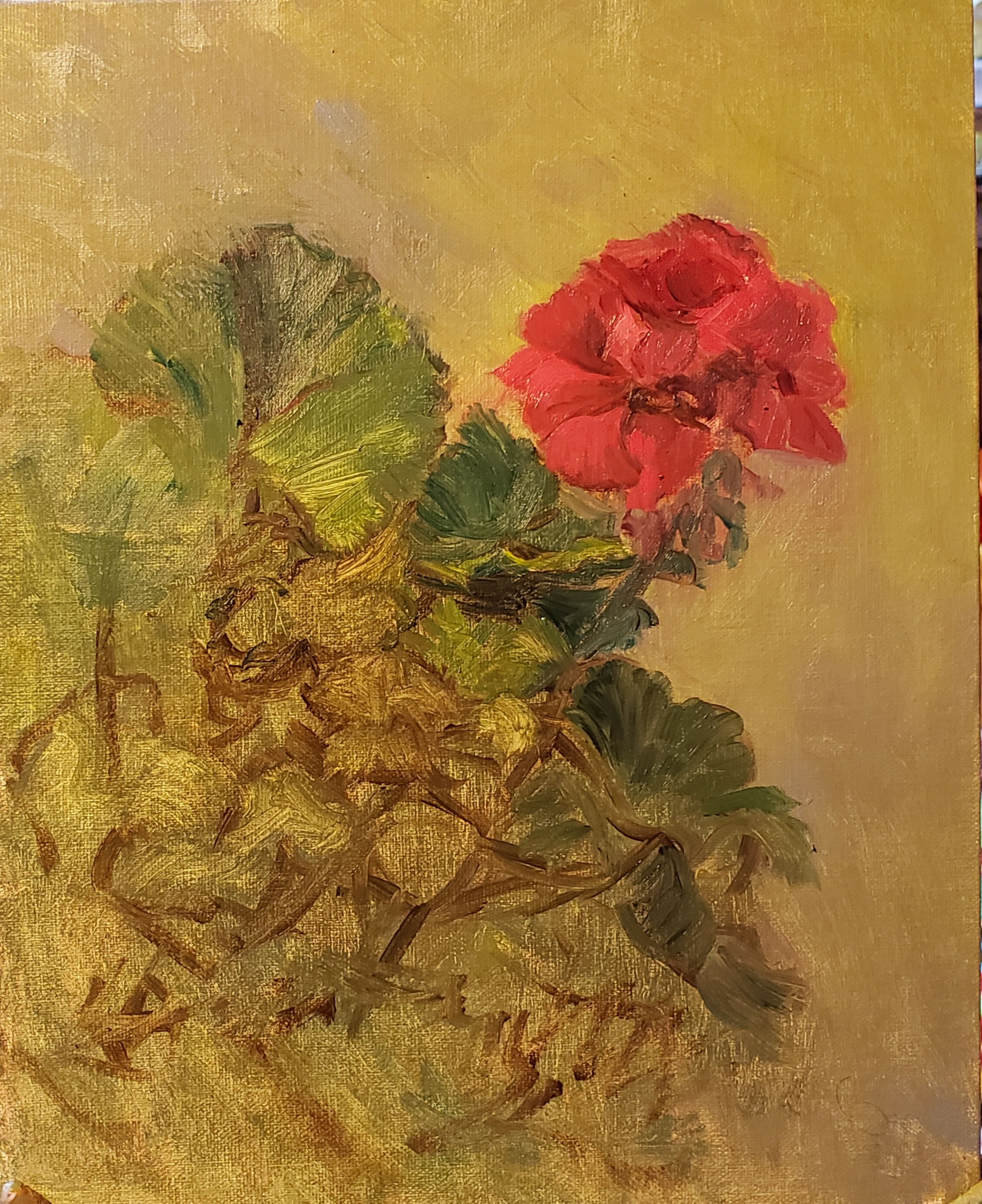 Painting from a geranium is a real challenge. The petals of the flower itself have a unique character. The leaves are phenomenally diverse. Both the flower and the leaves are very lyrical. I am staying with a limited palette. The colors are burnt umber, cadmium red, viridian green, cadmium yellow, yellow ochre and white. really trying to “feel” my way through this complicated mass of leaves. The endless variations are hard to deal with but I am really enjoying the “puzzle”