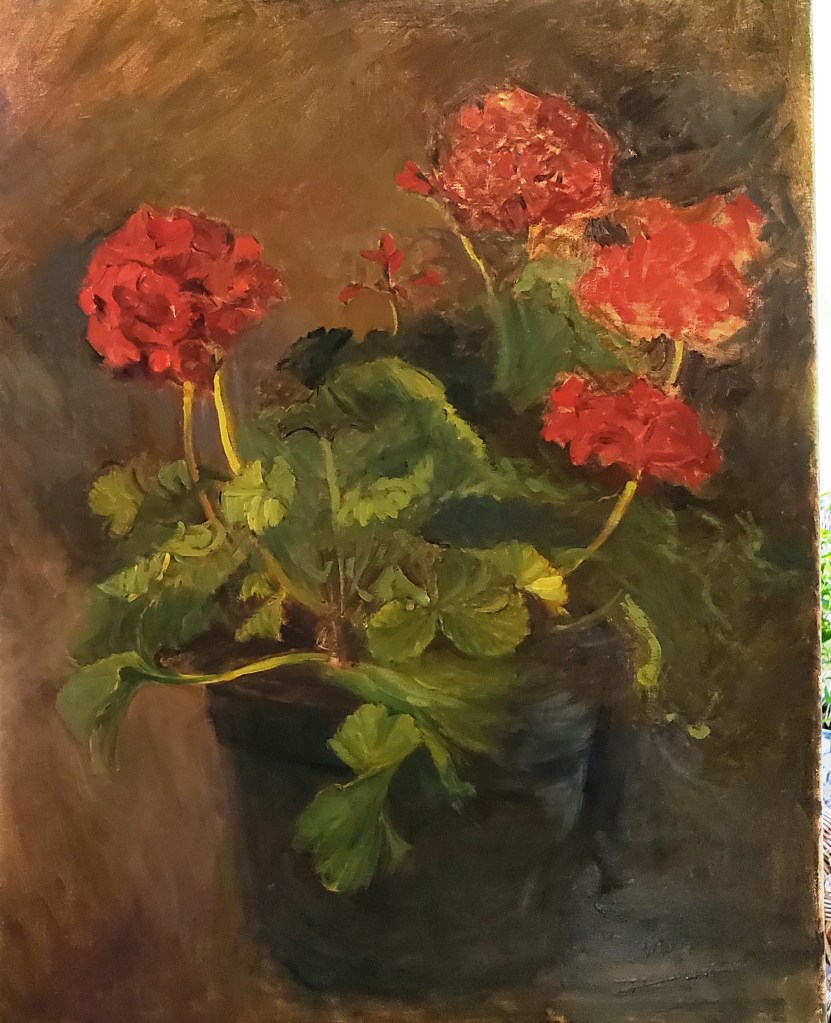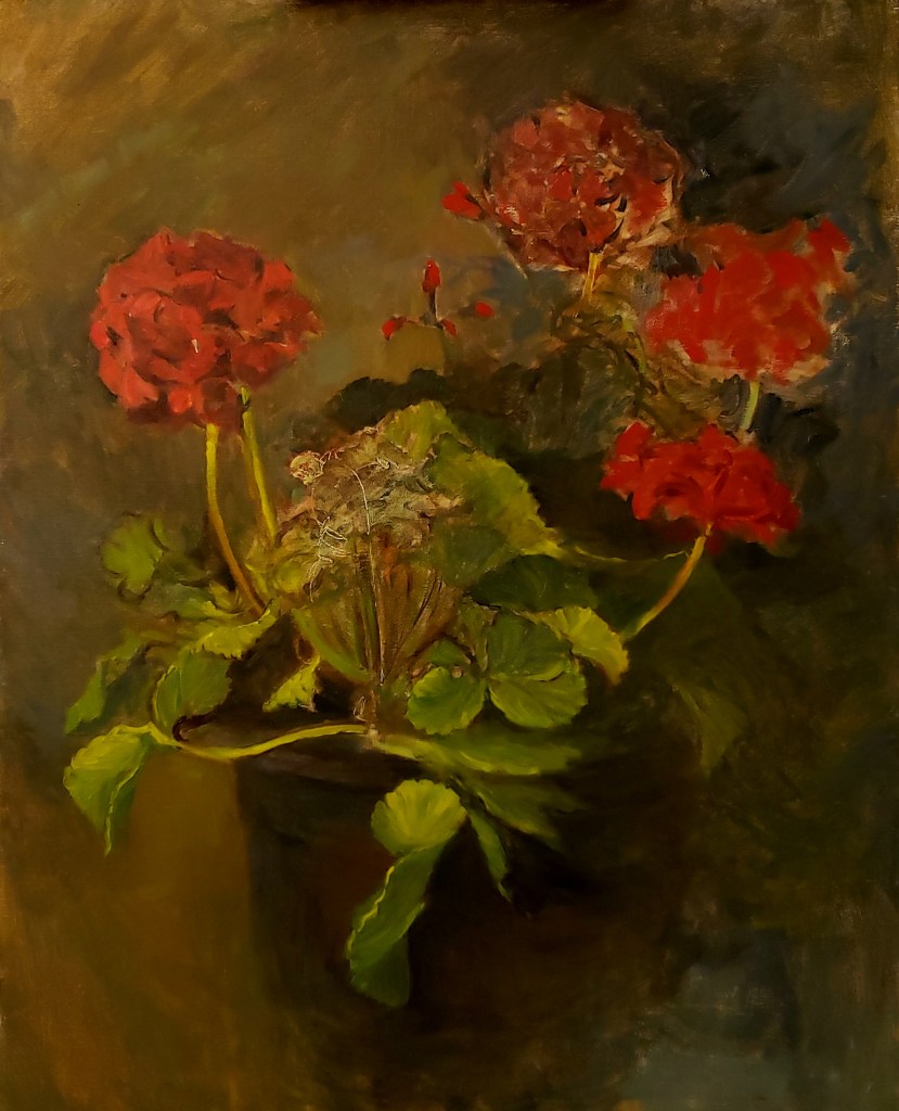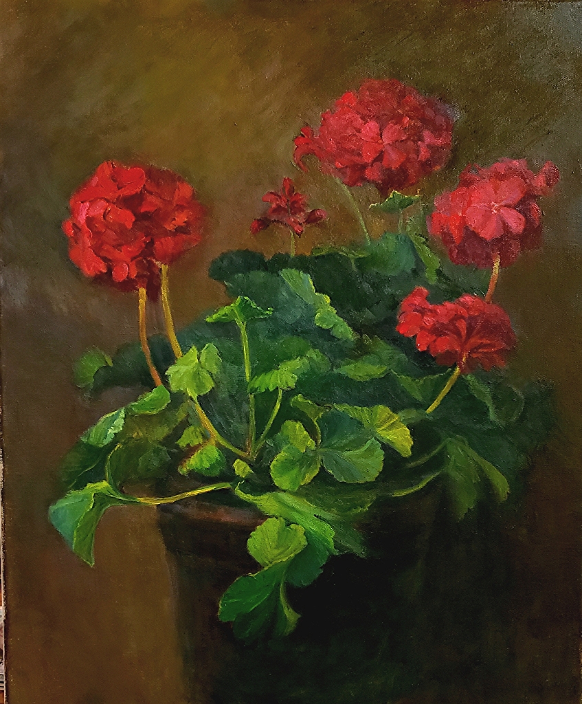 Continuing with the theme of the geranium. I really enjoy the challenge of painting this flower. I have lightly stained the canvas with a warm burnt sienna. Put in a loose grid dividing the canvas into thirds. I like to do this sometime especially when dealing with so much variety of forms. The palette is Vandyke brown, burnt sienna, ultramarine blue, terra verte, viridian green , alizarin crimson, cadmium red, yellow ochre, cadmium yellow, and titanium white. Using gamsol to loosely lay in the composition. Taking time to measure and finding angles and shapes first treating the picture format in a very flat two dimensional design. Next start to articulate shapes more closely and definign the light and dark patterns. Then start to address the local color in the flowrs and leaves and trying to relate to the warm/cool background.