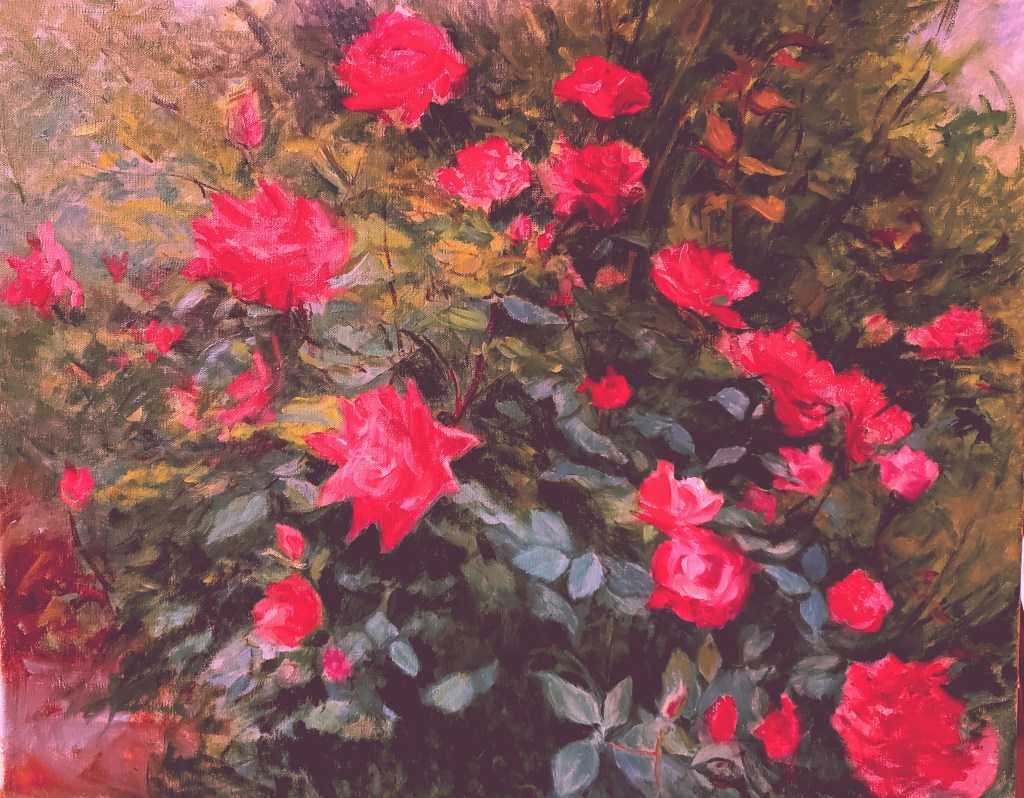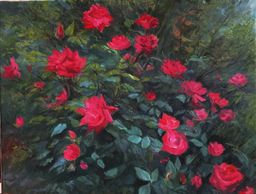 I am enjoying the challenge of painting roses. This painting is (16×20) and began as a plein air study and completed in the studio. It is a very special rosebush to me and I am so glad that it is thriving and blooming profusely.