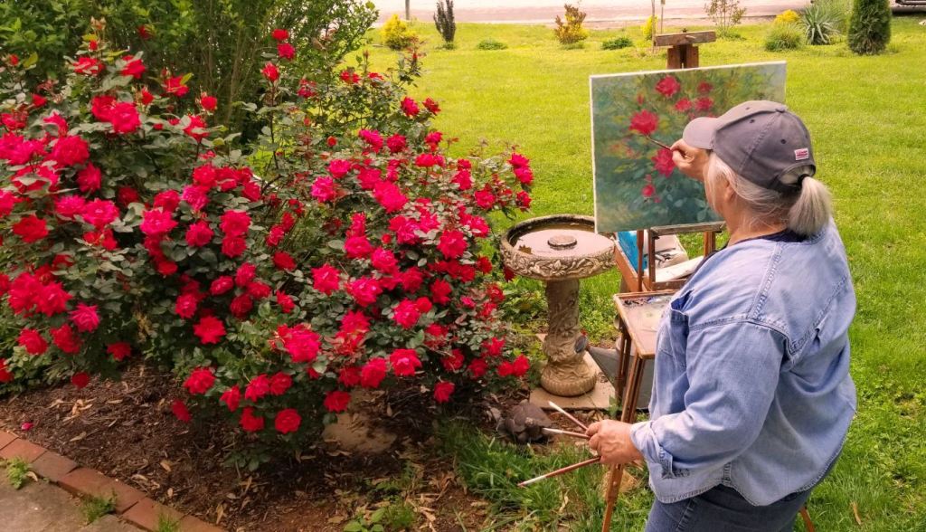 This painting was begun outside then reworked in the studio. I was not pleased with the results and decided to take it back outside and of course the position of the roses had changed and there were many many more blooms. I reworked some in and also changed the original composition. I got rid of the white house which intrigued me at first but decided it just wasn’t fitting into the composition anymore. At this point the painting was very “spotty” darks and lights popping out at random with no real sense of light. The drama of the deep reds against the warm and cool leaves are a challenge I had to find one more good day to work on this painting. Hopefully, tommorrow I will be able to resolve many problems. .