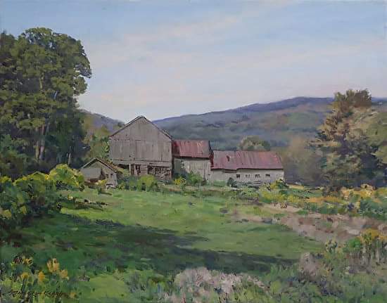 Working Method: Stapleton specializes in landscapes that are painted on location, but are often finished in the studio. When asked about his working method his reply is: “Everything I do is begun outside, everything I do is worked on in the studio. I would guess about a quarter of my painting time is on location outdoors. I throw away about half of my outdoor “starts” and work in the studio to finish the rest. I do a lot to my paintings in the studio often reworking them extensively. Outside I seek information, inside I seek to add art.”