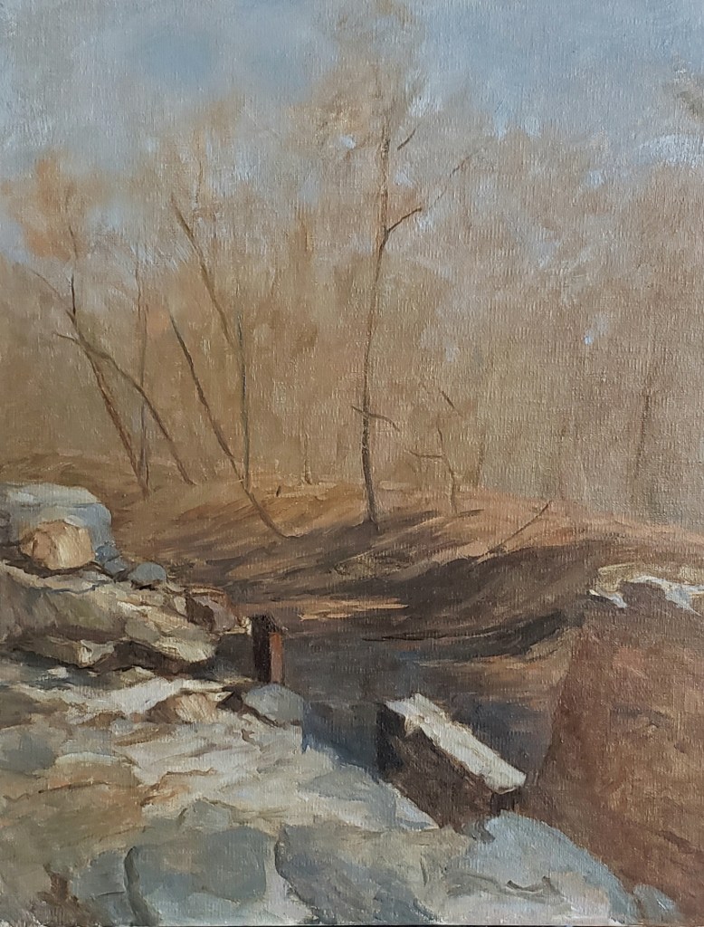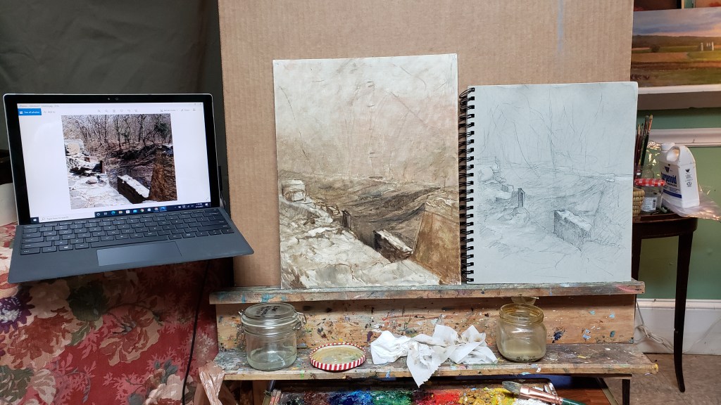 In the middle of the painting. Sustained paintings have a whole different temperament. The working method is much more thoughtful and deliberate. When painting outside I usually have a real conversation with the elements, i.e. the changing light is always problematic. The color also changes but even when using a drawing and a photo and my memory I can pick up on certain elements that do not change. Mostly the composition. the hard diagonals and triangular form of the stone wall are anchors and I welcome the stability and play this off of the soft distant hues of the trees and beautiful curving and sweeping up from the canal to the plane of land.