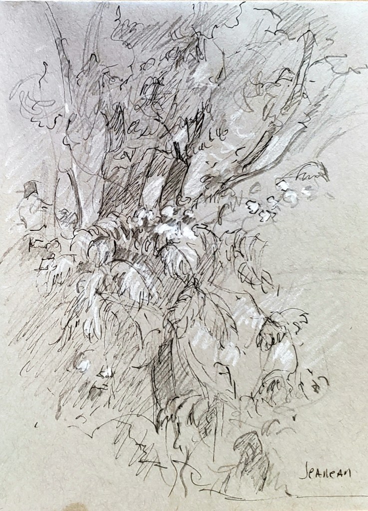 We are able to chose our own location under the shade of a lovely row of trees. Dawn offers us to partake of her delicious fresh spring water. “Just help yourself. The hose is right by the barn. You can even drink out of the hose like I do she laughingly says”. We eagerly accept and fill our containers. The gift of water and a safe quiet haven to sleep is worth its weight in gold. Instead of gold I offered $20 and a little sketch. I would love to stay here again and even managed to paint a little study of a delicate Mimosa tree .
