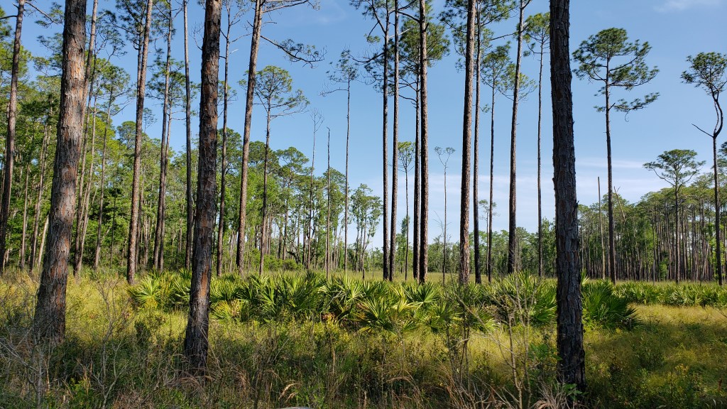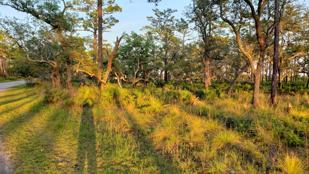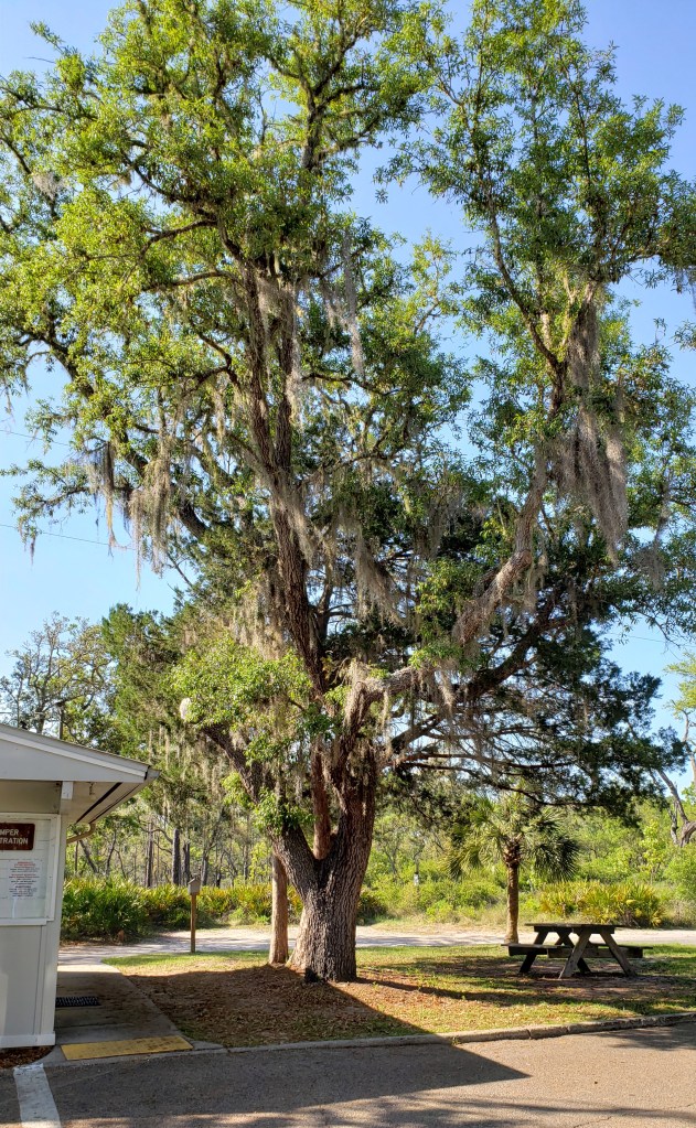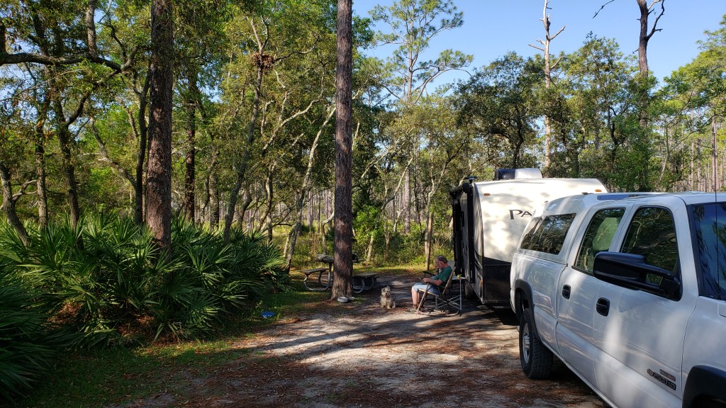 DAY 6: OCHLOCKONEE RIVER STATE PARK   It was very hard to leave the beautiful Pensacola, Destin, Santa Rosa areas.  Each had its own special beauty and we barely scratched the surface but travel on we must.  Because Carl hates paying tolls I decided to find a route to our next destination on a “back road” that did not incur tolls.  BIG MISTAKE! I love travelling off the beaten highway path but this travel experience was awful.  Rt. 20 is ugly.  Nothing but miles and miles of nothingness except for the tree farms.  We decided that is what we were looking at tall pines with no bottom branches lined up mile after mile.  Some had been harvested and the debris was left to waste in unsightly heaps.  The long stretch of road bordered by these straight vertical trees started to feel oppressive.    I felt like I was in a tree-lined “road prison” with no way out but down the relentless long straight road ahead.  Panic quickly set in and I wanted off this road immediately but there was nowhere to go. Finally, finally we entered a town whose name brought tears of laughter.  The little town of “Sopchoppy” was a welcomed sight.