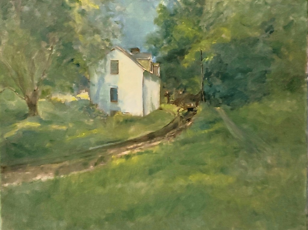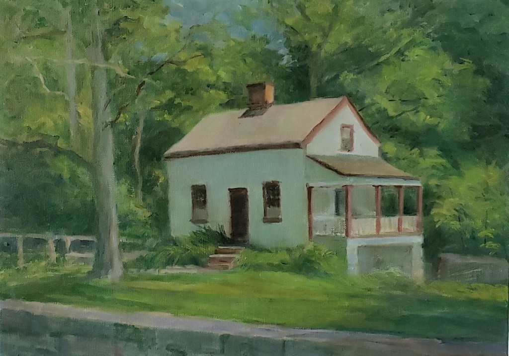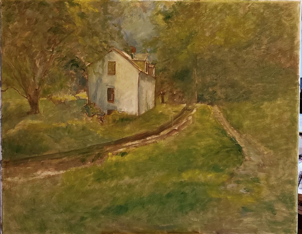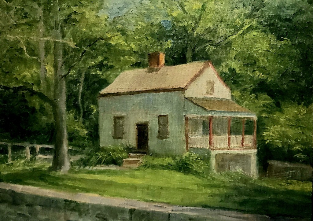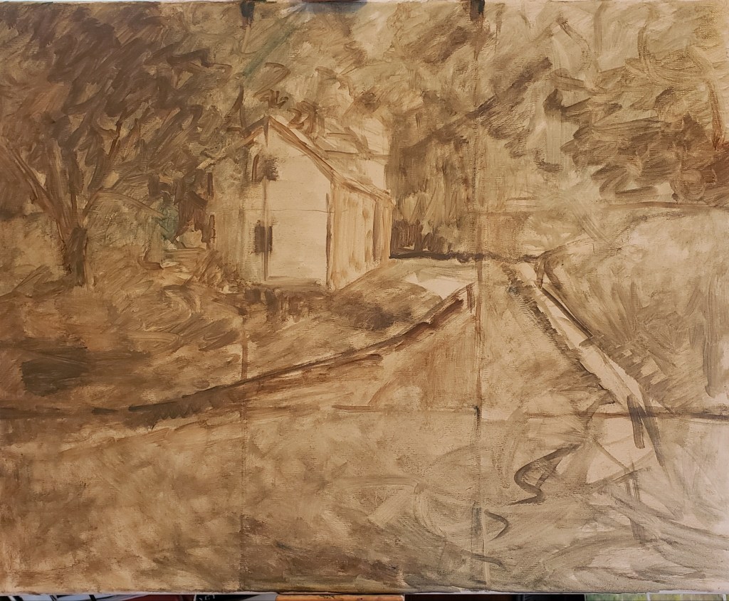 Lock #7 is a very charming place. The grass is a little unruly which I prefer. The lockhouse is nestled under a large tree and right next to the lock. I started an underpainting in burnt sienna using a sketch and a photo as a reference. The first day painting on site I already had my composition set but then the challenge of making the local color and my drawing work together begins.