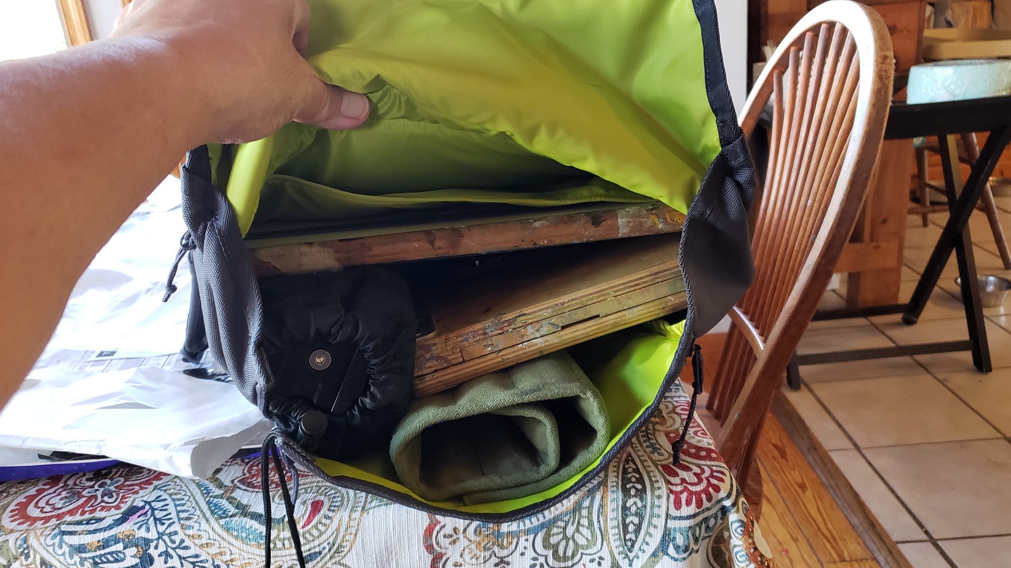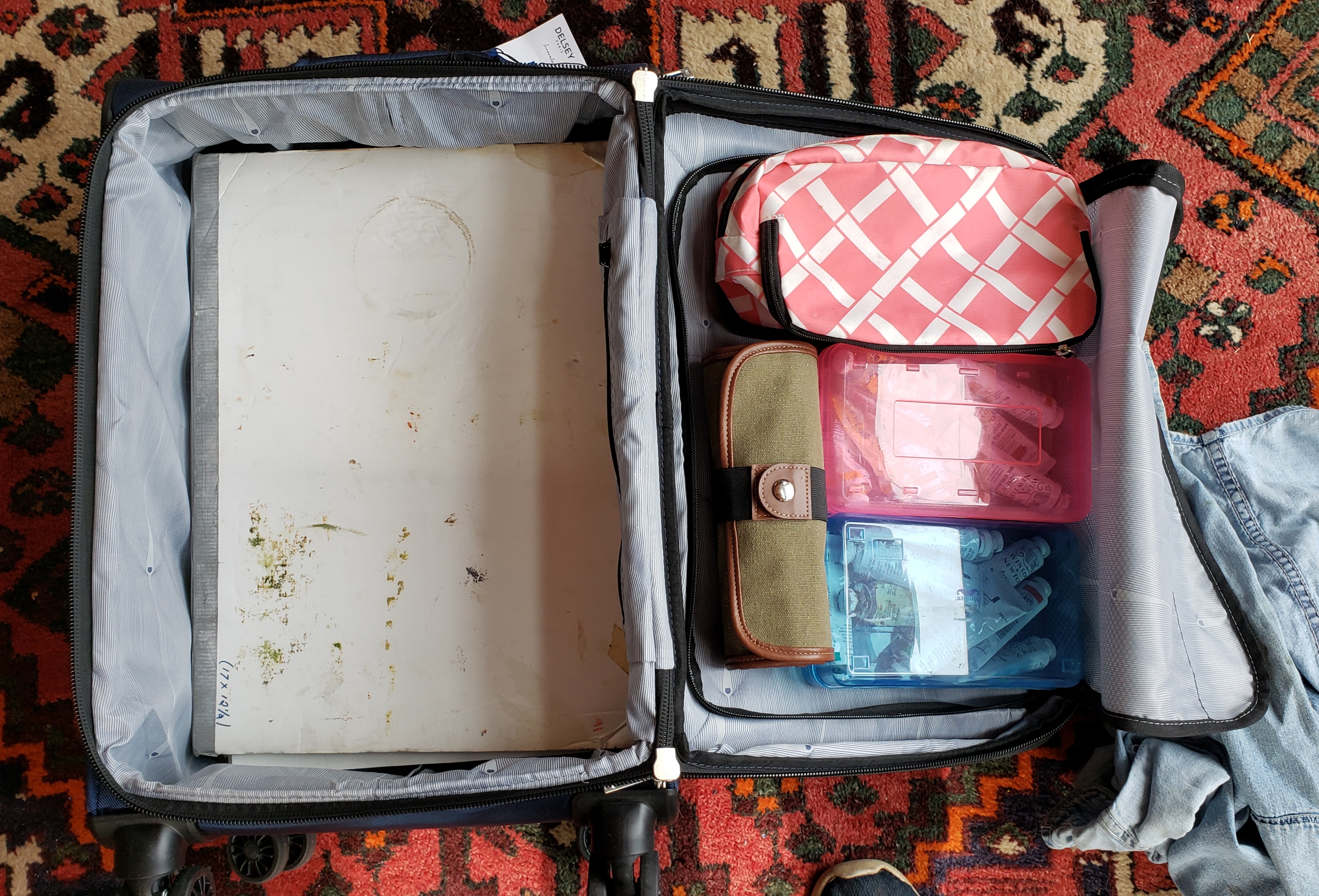 OIL PAINT, BRUSHES, PALETTE KNIFE, DRAWING SUPPLIES: On the right side in the zipped pocket area. Two plastic pencil boxes. one for warms, one for cools and a palette knife. A toiletry bag, brush, toothbrush. Still plenty of room to stuff socks, underwear, small stuff, swiss army knife (Carl has rubbed off on me) around in this area