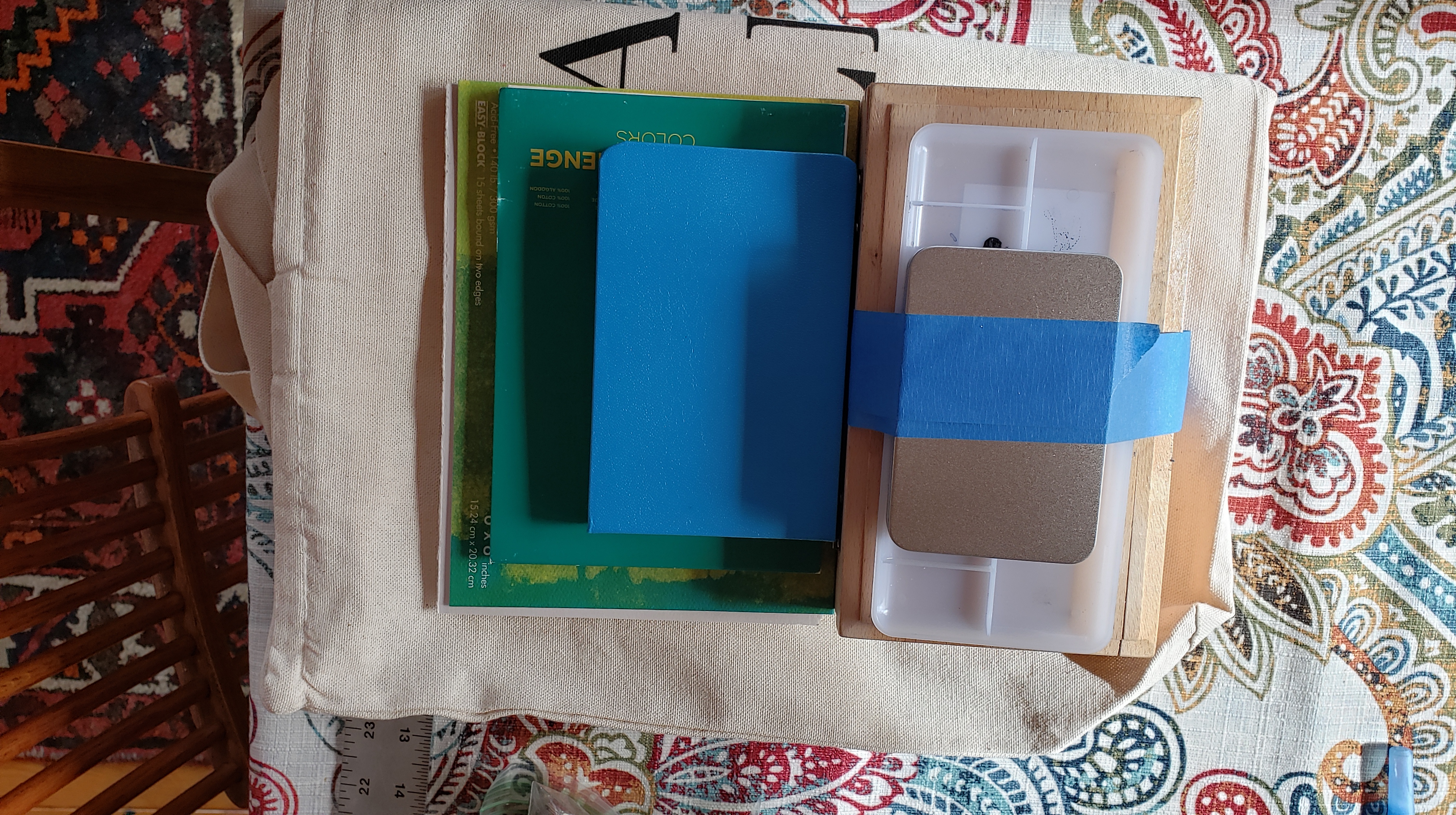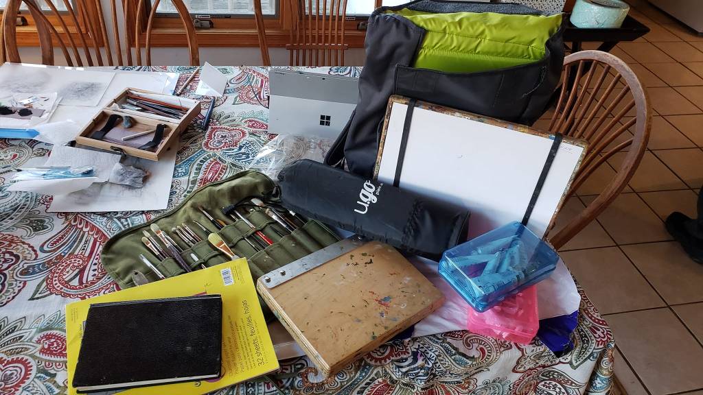2.BACKPACK: weighs 11 lbs. (place in the overhead). Easel, tripod, panel pak, brush holder, journal, sketchpad, small laptop (may switch to an i-pad). I do like to type though . There is room for alot of other small stuff but I don’t want to make it too heavy to carry on my back