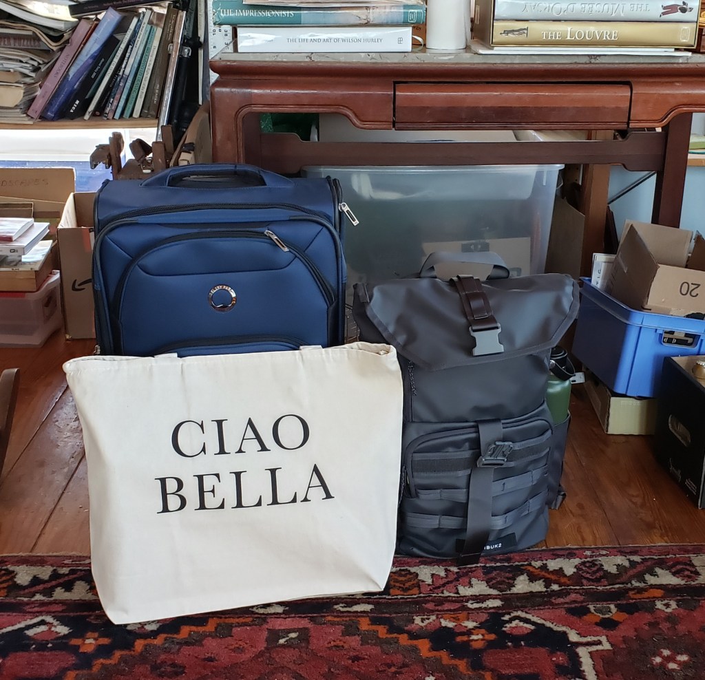 Oh my goodness, isn’t this crazy. trying to cram in art supplies and leaving a little room for clothes. I forgot how hard it was to pack with art supplies. I am spoiled travelling in my RV where I can bring my studio with me. I am bringing a heavy jacket and a scarf, hat I will probably wear it on the plane. I can always stuff it in the overhead. In the evening it might get chilly there even in the Spring the mountains get cold at night. “The weather in Padula in May is moderately chilly with a gentle breeze, with average highs of 68°F (20°C) and lows of 50°F (10°C).” I learned many years ago when teaching Plein Air Painting Workshops that it is absolutely essential to pack light. The key is to “layer”. Once when we were in France our group could not fit in the rental cars with so many large suitcases. We had to upgrade both vehicles at a huge expense. We also had trouble getting on trains and busses, going on escalators, walking on uneven pavement, cobblestones streets. In general, lugging a huge suitcase is miserable. Just don’t do it. Since then I have followed some of the Rick Steve’s suggestions for packing, with changes for painter’s needs of course. See here: https://www.ricksteves.com/travel-tips/packing-light/packing-smart