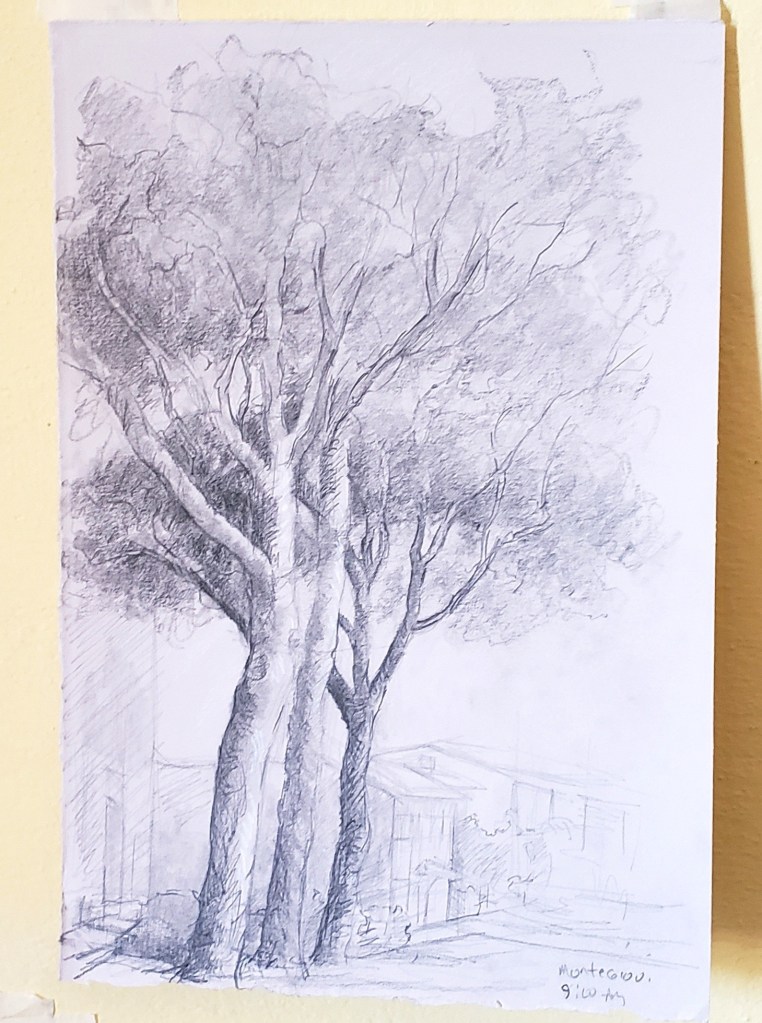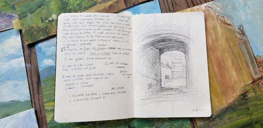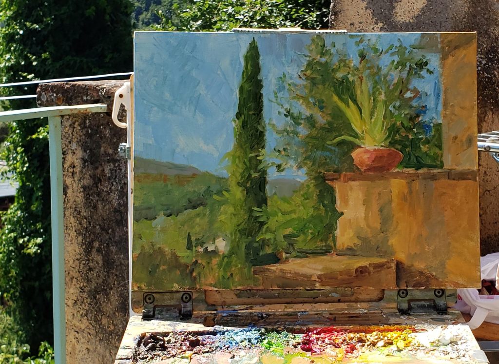 Many have asked me how do you transport your painting materials and also how do you bring back wet paintings. The main thing to remember is that you should always pack your oil paints in your checked baggage suitcase, never carry on. Because I am using panels I can fit them in my suitcase in between my clothes. For the most part I am using smallish lightweight panels no larger then 11 x 14. I use Raymar lightweight panels, Centurion Deluxe Oil Primed Linen Pad 11″x14″ (10 Sheets), multi-media artboard that I mounted linen onto. I have two small plastic pencil boxes that I keep my warm colors in one and cool colors in the other. My palette knife and assortment of brushes go in a cloth brush holder in my checked luggage. i had my palette knife conviscated once. in the past i have always brought my trust 1/2 size French easel but i have downsized to a small New Wave U.Go Pochade Box https://newwaveart.com/ and tripod which is packed in my carry on. I don’t use alot of medium only a little turp. that I purchased in Italy. They do not sell gamsol. A good substitute is Diluente Inodore – odourless thinner, I learned my lesson the last time travelling that weight is a very important factor. 21 paintings, 15 drawings made it home safely and lots of fond memories. In the field using a panel pak (https://www.panelpak.com/)to put a wet painting into is also helpful or a small pizza box in a pinch. Thank goodness for pizza boxes, parchment paper and tape. that is how I brought my work home wedged in between my clothes. Tape a sheet of parchment paper over each painting and sandwich together tightly. The idea is not to let the panels move around and possibly smear. As soon as the work is tweaked I will post individually for the curious. It was a very successful residency and I am very grateful to La Baldi